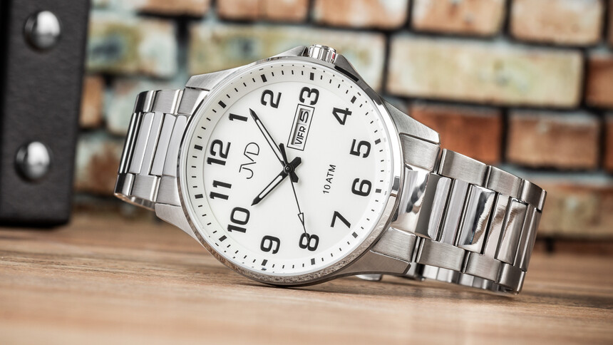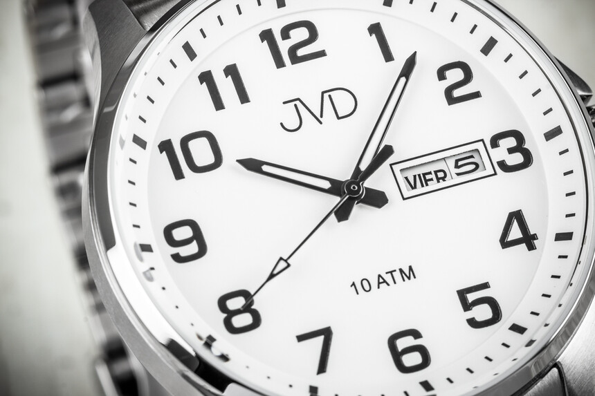 Velké přehledné číslice, indexy pro jednotlivé minuty, kontrastní ručky, luminiscence a také datum. To vše mají hodinky JVD. Pouzdro je z oceli, navíc většího průměru, a má 100metrovou voděodolnost, takže žádný běžný kontakt s vodou by neměl být problém. A zobrazují i den v týdnu.