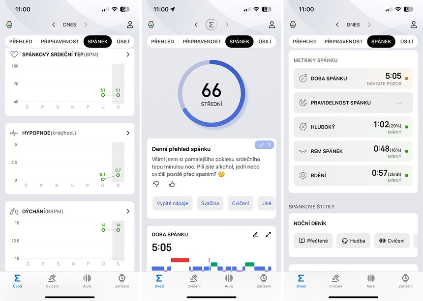 Co sleduji já? Samozřejmě jako první kouknu na spánek. Dozvím se vše o jednotlivých fázích, mám k dispozici hodnocení na stupnici od 0 do 100 a navíc můžu zadávat i to, co jsem dělal před spaním. Ať už šlo o nějakou aktivitu, hraní her nebo třeba čtení knížky, umělá inteligence to všechno bere v potaz a vyhodnocuje, co na mě má pozitivní a co naopak negativní vliv.