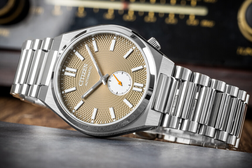 Nutno taky uznat, že Citizen vynaložil větší úsilí na zdobení strojku oproti prvním standardním Tsuyosám, které dostaly daleko spartanštější péči. Na strojku 8210 je všechno poměrně strohé a industriální, ačkoli musím přiznat, že se mi ten zlatý povrch připomínající rustikální mosaz vlastně líbí, má své kouzlo.
