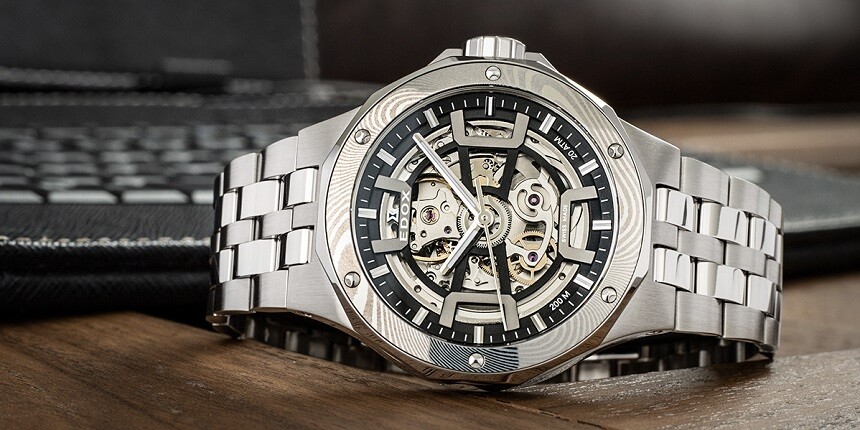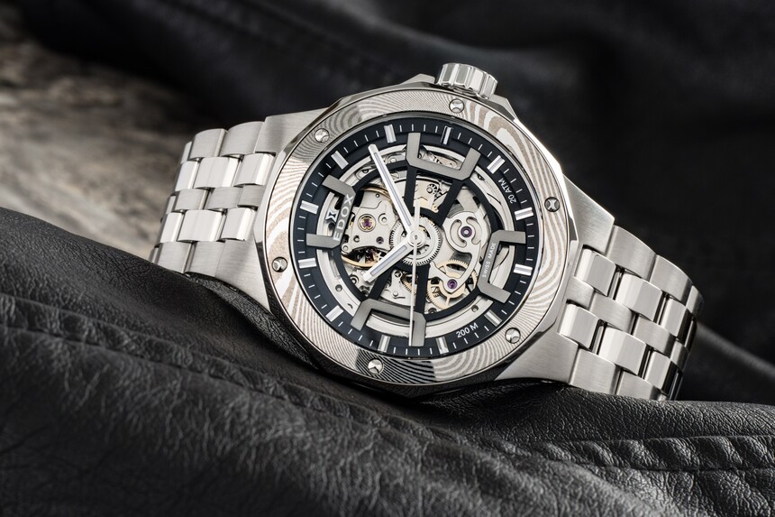 Už z produktových fotek (nebo názvu) je jasné, že hodinkám se dostalo damaškové oceli. Není z ní sice celé pouzdro, ale jen vložka lunety, ale efekt to má dostatečný.