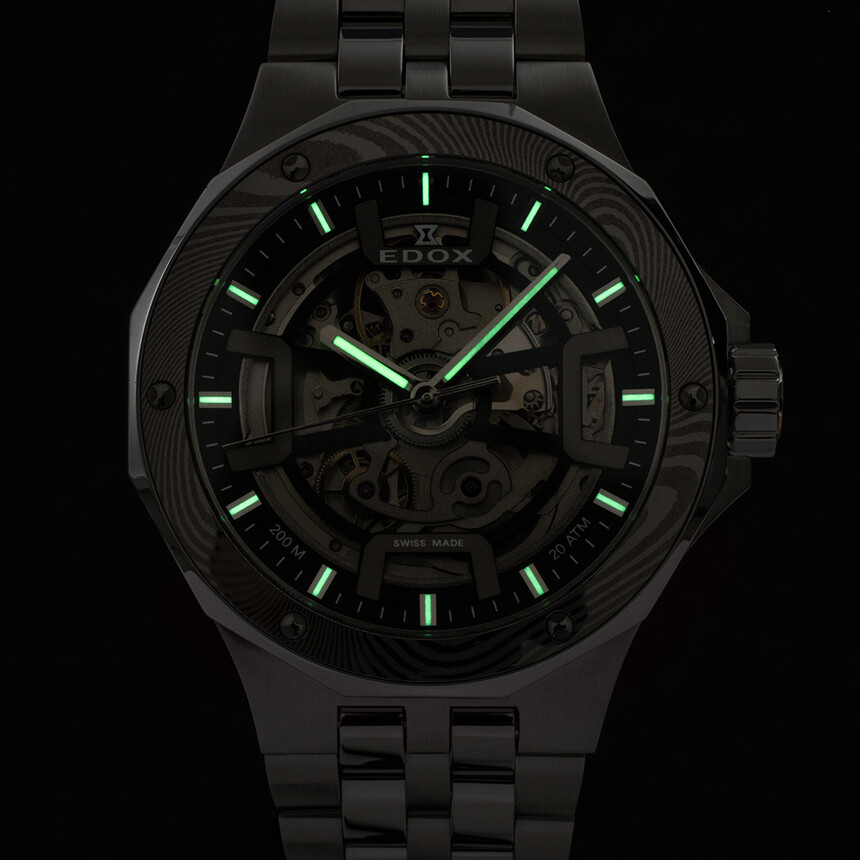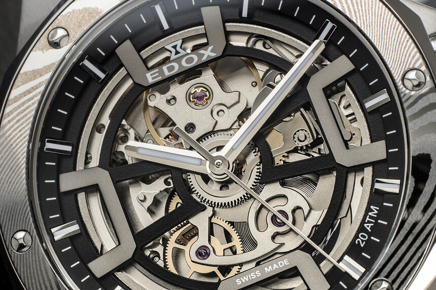 Damašková ocel krásně doplňuje vrstvený číselník a k modelu se tak hodí. Edox navíc poukazuje na vzor připomínající vlny, a proto si s ní pohrál právě u Delfinů. Potápky, voda, vlny... chápete.