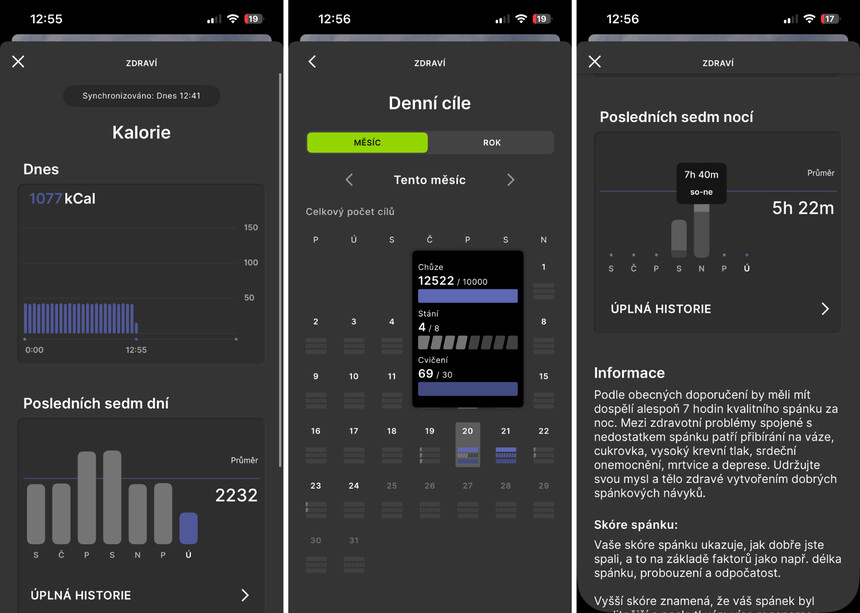Lehce jsem to už nakousl v předchozích kapitolách, ale z hlediska zdraví hodinky měří spálené kalorie, kroky, stání, aktivní minuty a také spánek. U něj je škoda, že vidíte pouze lehký a hluboký spánek, nikoliv REM fázi.