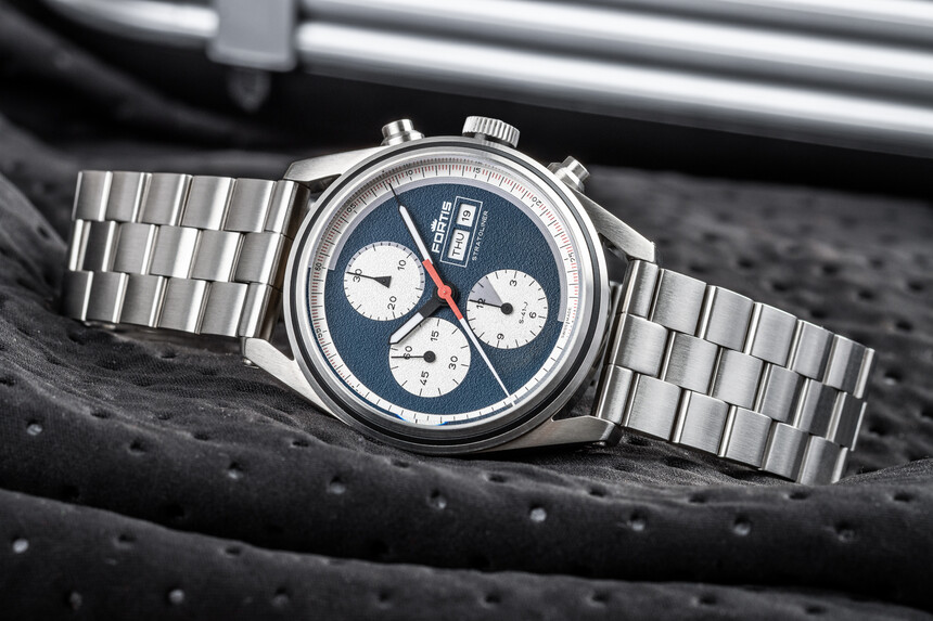 Najdeme zde tři bílé subčíselníky – jeden na sekundy klasického strojku, jeden na půlhodiny po minutách a jeden na hodiny. Na pravé straně číselníku je pak logo Fortis a ukazatel dne v týdnu a dne v měsíci.