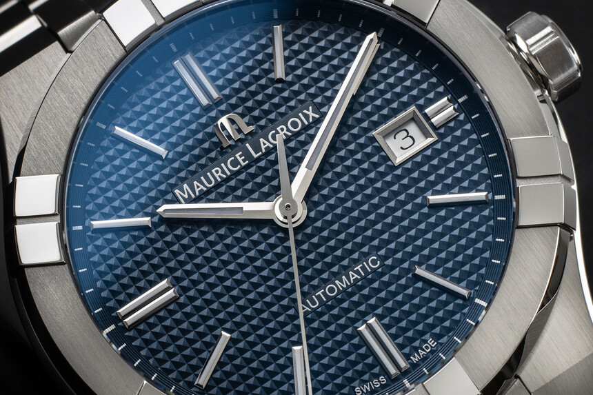 Dále najdeme na číselníku aplikované logo s názvem firmy Maurice Lacroix pod dvanáctou hodinou, na šestce obligátní nápis SWISS MADE a mezi šestým indexem a ručkami nápis AUTOMATIC. Aikony se totiž vyrábějí jak v mechanické verzi, tak ve verzi quartzové, a tak je tento nápis jedním z poznávacích znaků, jak rozlišit typ strojku.
