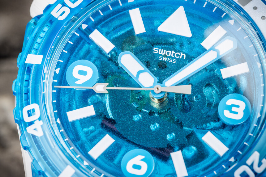 Po delší pauze přichází Swatch s modelem, který má voděodolnost do 100 metrů. Pouzdro kombinuje biokeramiku a bioplast z ricinového oleje. Díky tomu váží jen asi 38 gramů, na dotek působí hladce, žádné ostré hrany. I přes průměr 44 milimetrů sedí na zápěstí skutečně pohodlně.