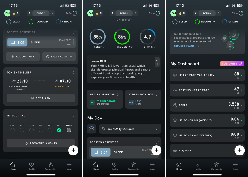 Co je ale na tom všem nejlepší – vy to vůbec nemusíte sami sledovat. Whoop má totiž funkci Health Monitor, která průběžně hlídá, jestli je všechno v pořádku. A také Heart Screener, který provádí pravidelné EKG a sleduje případné abnormality.