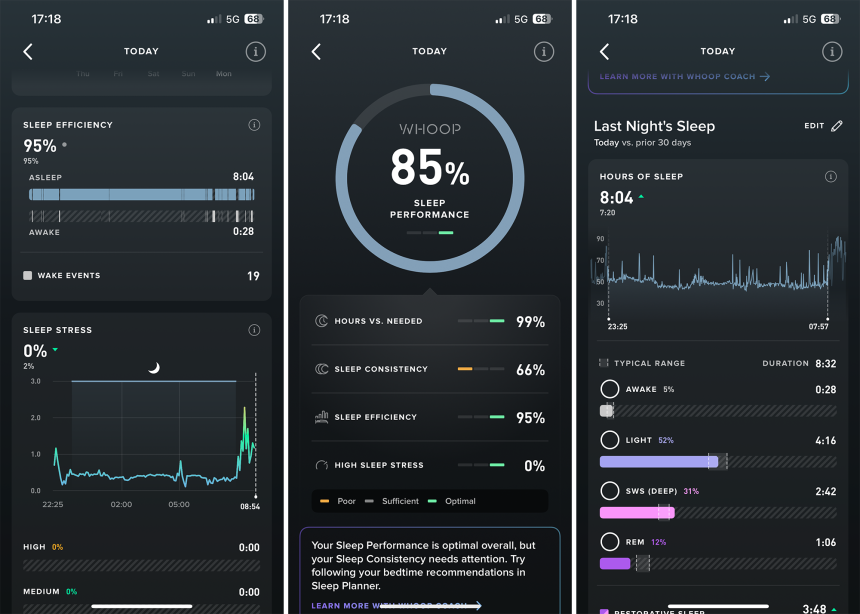 Whoop totiž na základě stresu, aktivit a posledního spánku vypočítává, kolik spánku vlastně potřebujete. Sleduje také konzistenci usínání a probouzení, protože pro tělo je velmi důležité udržovat pravidelný rytmus. A samozřejmě hodnotí i efektivitu, která je kombinací délky spánku a množství REM i hluboké fáze.