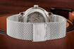 Ručky ve tvaru Alfa, římské indexy na 12 a 6, použití mesh náramku.