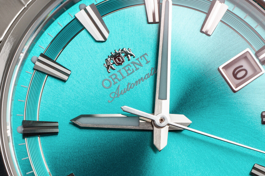 Kromě toho tady ale máme také jeden model, který září už z dálky. Dominuje mu méně obvyklá oranžová v kombinaci se světle tyrkysově modrou. Ale to není vše. Hravost tady Orient (a budoucí majitelé) projeví i jedovatě zelenou sekundovkou, a to celé na poměrně konzervativním odstínu tmavě modrého číselníku.
