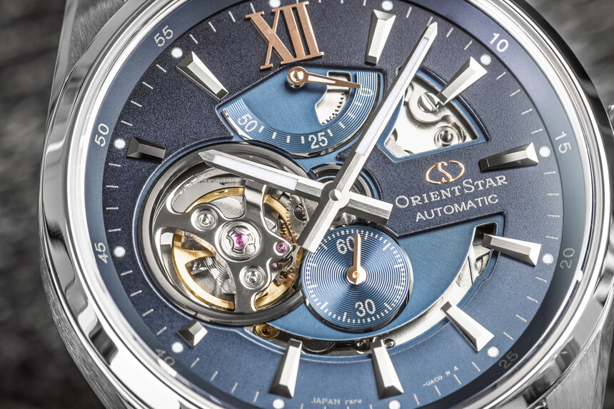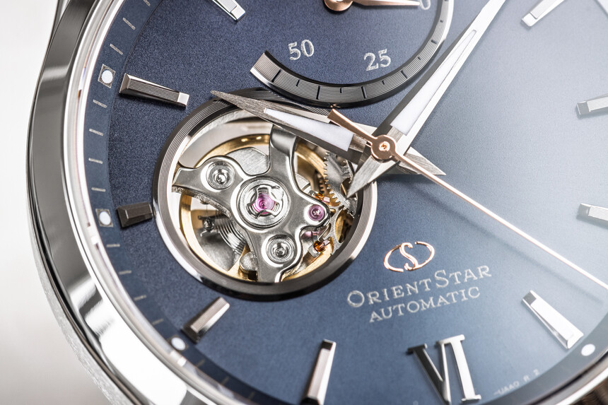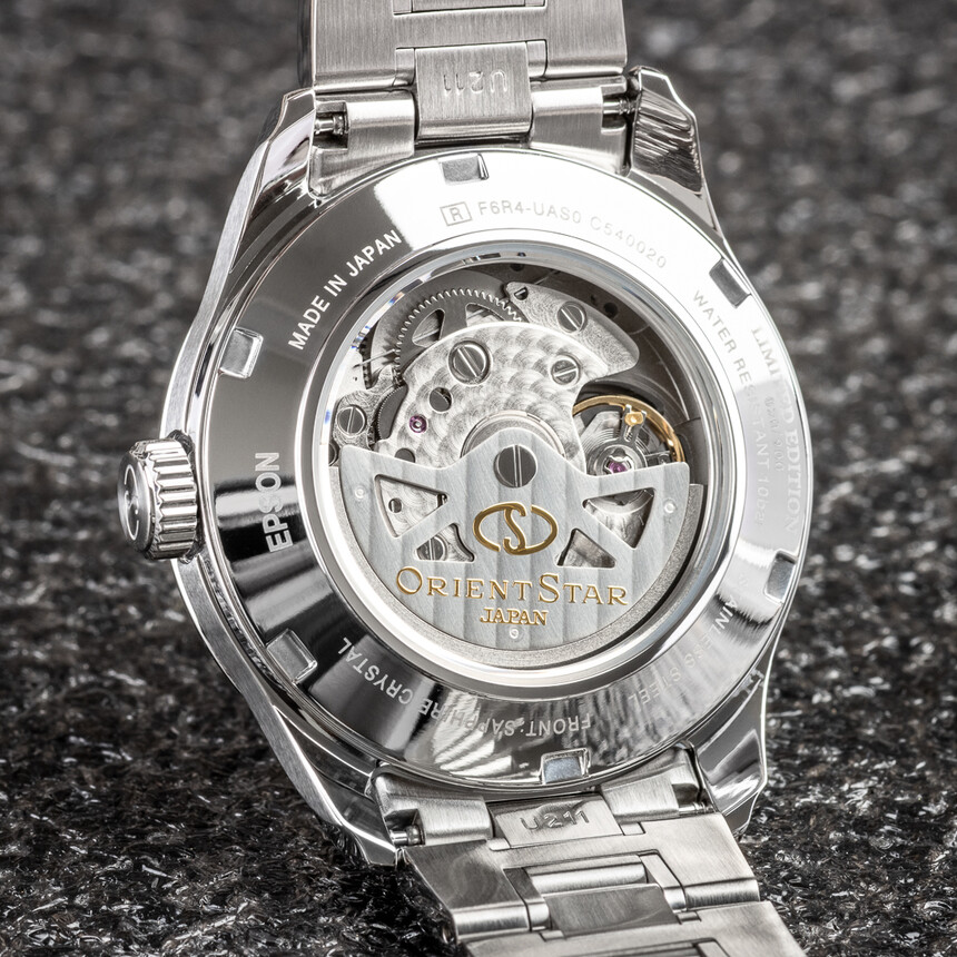 Na mnoha místech odhaluje automatický strojek a zajímavě si hraje s přesahy například indexů. Pozorovat můžete in-house strojek s automatickým nátahem F6F44. Nabízí okolo 50 hodin chodu, běží rychlostí 21 600 polokmitů za hodinu a kromě malé sekundové ručky má komplikaci typickou pro značku Orient Star – ukazetel rezervy nátahu.