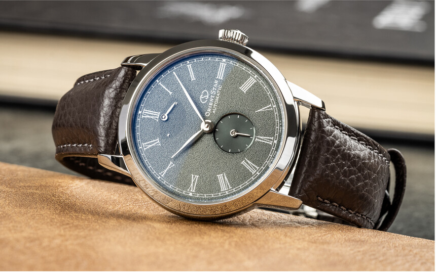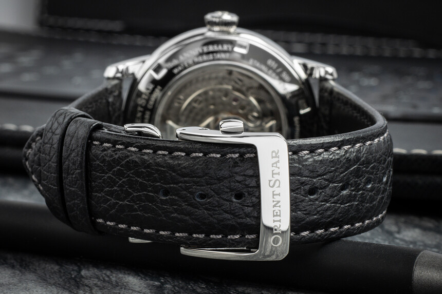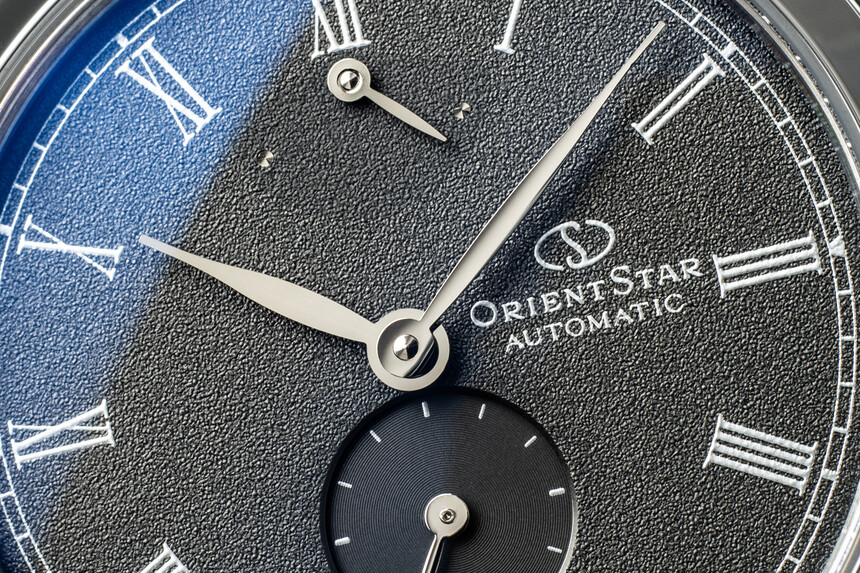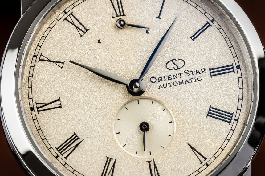 Na číselníku dále nalezneme již dříve zmíněnou rezervu nátahu v horní části a mimostřednou sekudnovku dole. Kromě nich zde nalezneme už jen logo Orient Star v pravé části a elegantní stříbrné ručky ve tvaru listu. Tištěné hodinové indexy v podobě římských čísel pak skvěle korespondují se společenským určením tohoto modelu.