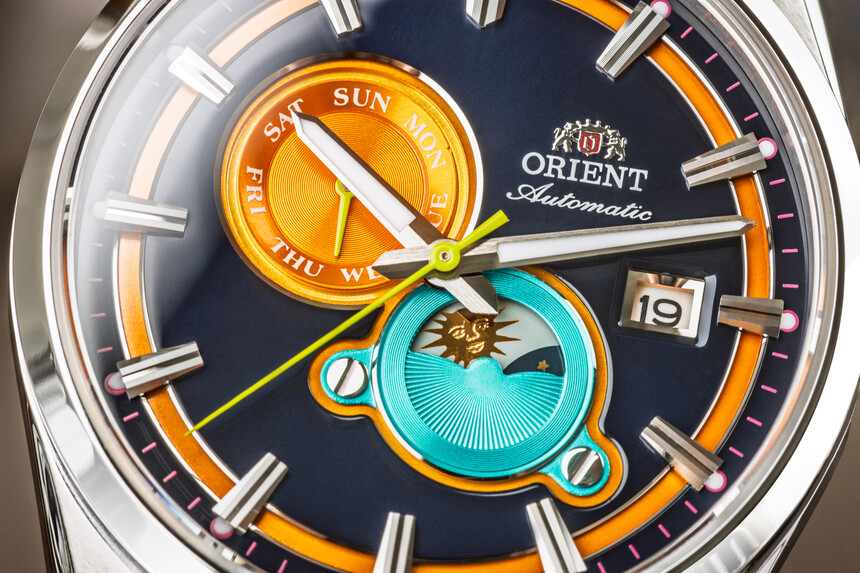 Kombinuje krásně kontrastní tmavě modrou s oranžovou, světle zelenou (vteřinovka) a dokonce i růžovou (indexy na okruží, kterých si sice člověk nemá šanci na dálku všimnout, ale na blízko vypadají naprosto famózně).