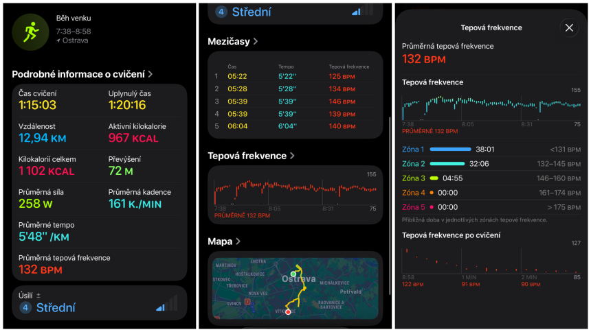 Samy o sobě jsou Apple Watche sice podobně vybavené, ale aspoň za mě mi to teda moc nesedí. Přijde mi, že na tréninkovou analýzu Apple moc necílí, což je celkem divné, když Ultry propaguje jako sportovně založené hodinky. Nicméně, v appce dostaneme údaje o tom nejpodstatnějším, i když, jak už jsem říkal, bych čekal něco víc.