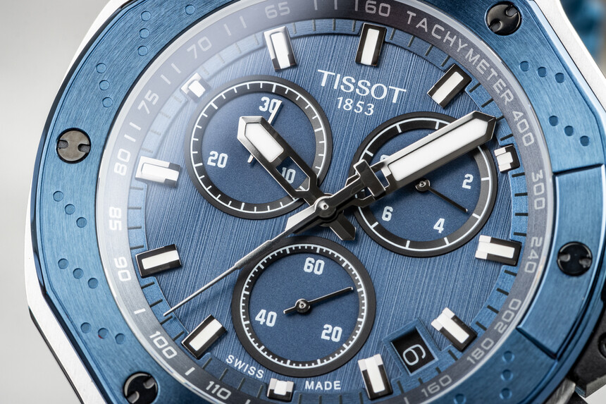 T-Race Chronograph 45 mm je pokračovatelem původní filozofie. Průměr 45 mm znamená, že hodinky mají stále výraznou přítomnost na zápěstí a sportovní charakter, který je okamžitě patrný a čitelný.