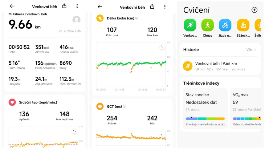 Rád bych vám poskytl i srovnání tepu, ale z nějakého důvodu nejde vyexportovat data o srdečním tepu. Nicméně, u 10kilometrého běhu Polar Verity Sense naměřil průměr 134 tepů, Xiaomi Watch 5 naměřil 136 tepů. Při běhu se mi párkrát stalo, že Xiaomi měřilo třeba o 10 tepů víc, ale přišlo mi, že to vždy bylo chvilkové zaváhání.