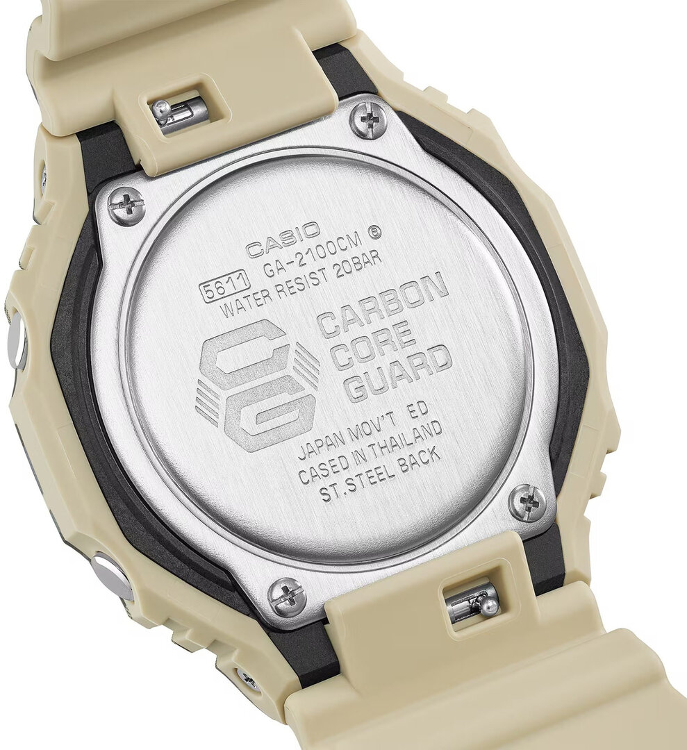 Díky použití karbonu, tedy konstrukce Carbon Core Guard jsou hodinky lehoučké a jejich „vnitřnosti" se podařilo vměstnat do pouzdra vysokého pouhých 11,8 mm, což dělá model GA-2100 snad nejtenčími G-Shocky vůbec. Průměr pouzdra, by se dal (ve světě G-Shocků) nazvat spíše jako „podprůměr". Ale právě díky tomu padnou hodinky dobře na ruku i „méně obdařeným" jedincům a snadno se schovají pod rukáv.