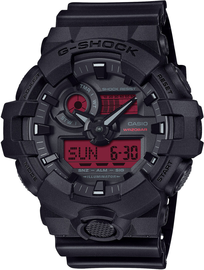 Z přehledu funkcí, kterými GA-700 disponují můžeme vyčíst trend, kterým se Casio snaží ubírat (a také se mu to daří), tedy neustále se zlepšovat a posouvat dopředu. Samozřejmostí jsou základní G-Shockovské funkce jako odolnost proti nárazu, voděodolnost 200M, stopky, alarm či automatický kalendář. Kromě tohoto základu tady ale najdeme i např. funkci „uklizení ruček" kdy se při používání digitálního displeje přemístí analogové ručičky tak, aby nepřekážely ve výhledu. Praktická je také možnost nastavit si domácí a světový čas, které je možné prohodit stisknutím jednoho tlačítka.