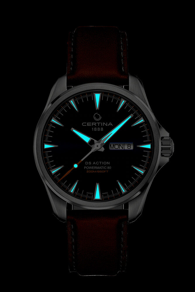 Hodinky Certina DS Action Automatic Powermatic 80 Day Date patří do modelové řady Aqua, která je, jak už sám název napovídá, určena pro milovníky vody. Všechny hodinky z této řady disponují minimálním stupněm voděodolnosti do 200 M, které v případě hodinek DS Action Automatic napomáhají šroubovací komponenty (korunka, dýnko) a především pak soubor opatření na zvýšení odolnosti – tzv. DS Koncept.