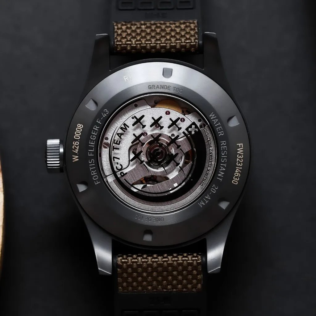 Mechanický s automatickým nátahem. Fortis Werk 13, Rezerva chodu 70h, 28.800 BPH (4Hz), 28 kamenů, Hacking