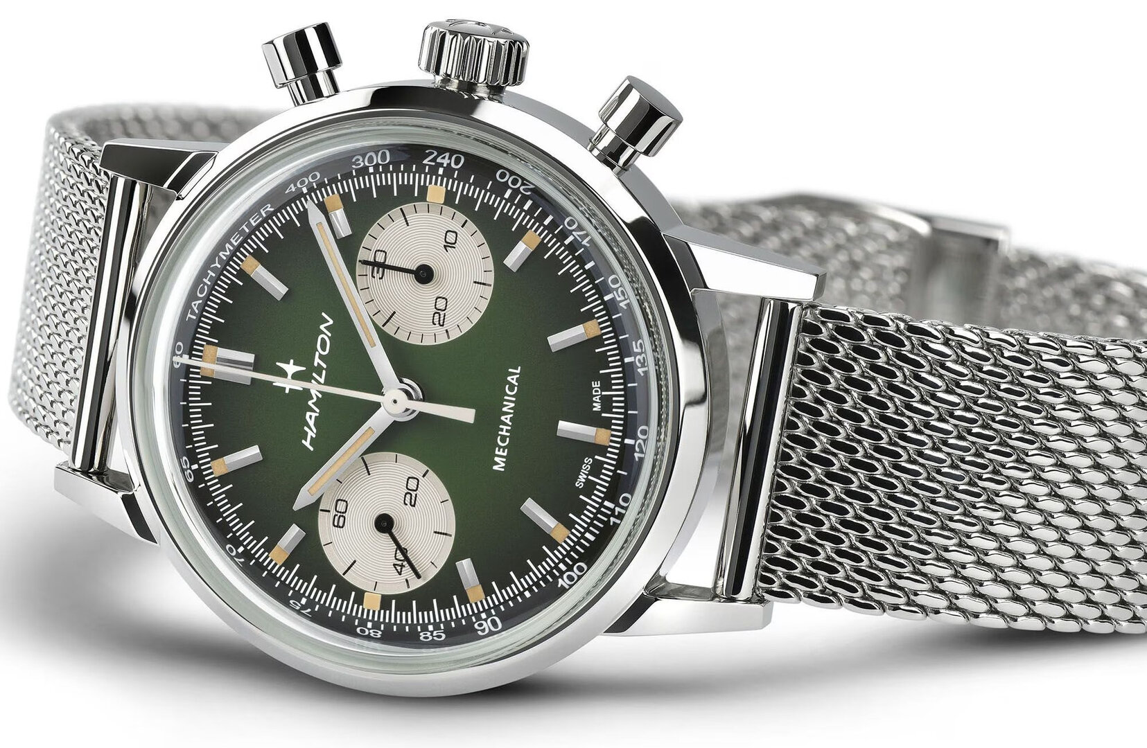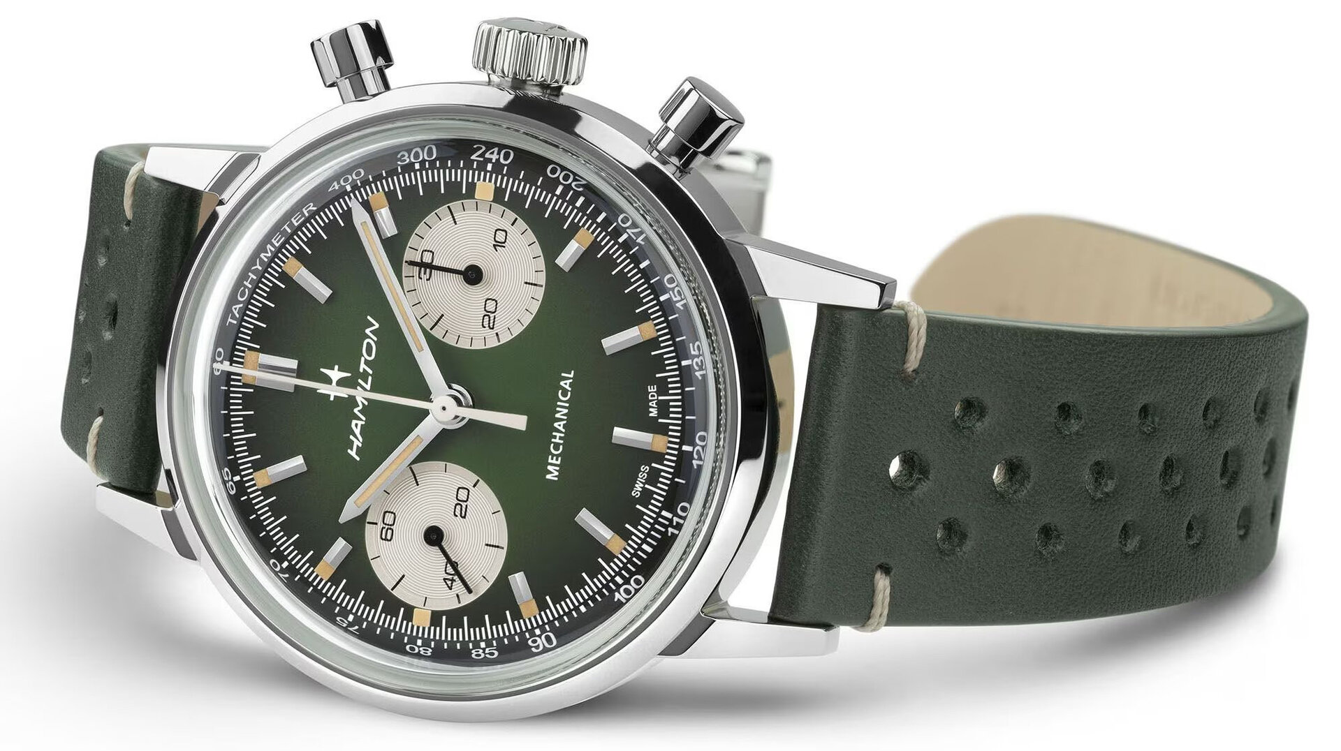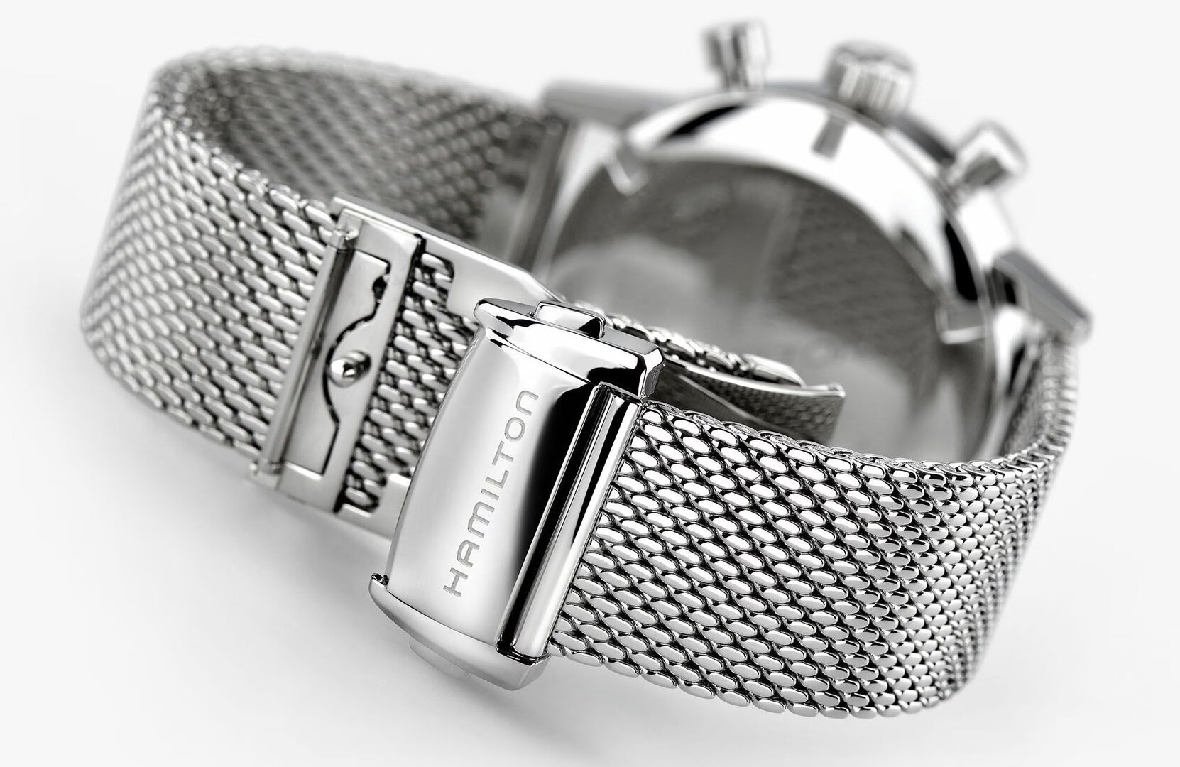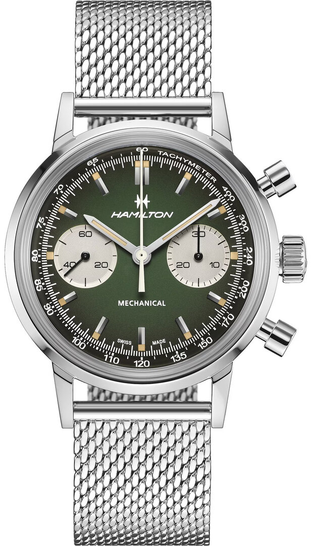 Už v té době ale měly chronografy od Hamiltonu švýcarský strojek. Tak, jak je tomu dnes. Uvnitř moderní podoby se ukrývá strojek H-51, který ETA vyrobila přímo pro Hamilton na základě svého Valjoux 7753. Nabízí 60 hodin rezervy chodu při zachování moderní frekvence 28 800 polokmitů za hodinu.