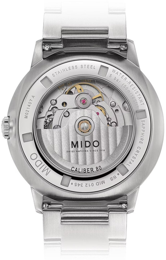 Mechanický s automatickým nátahem. Mido Caliber 80 postavený na ETA C07.621 postavený na ETA 2836-2 postavený na ETA 2824-2, Rezerva chodu 80h, 21.600 BPH (3Hz), 25 kamenů