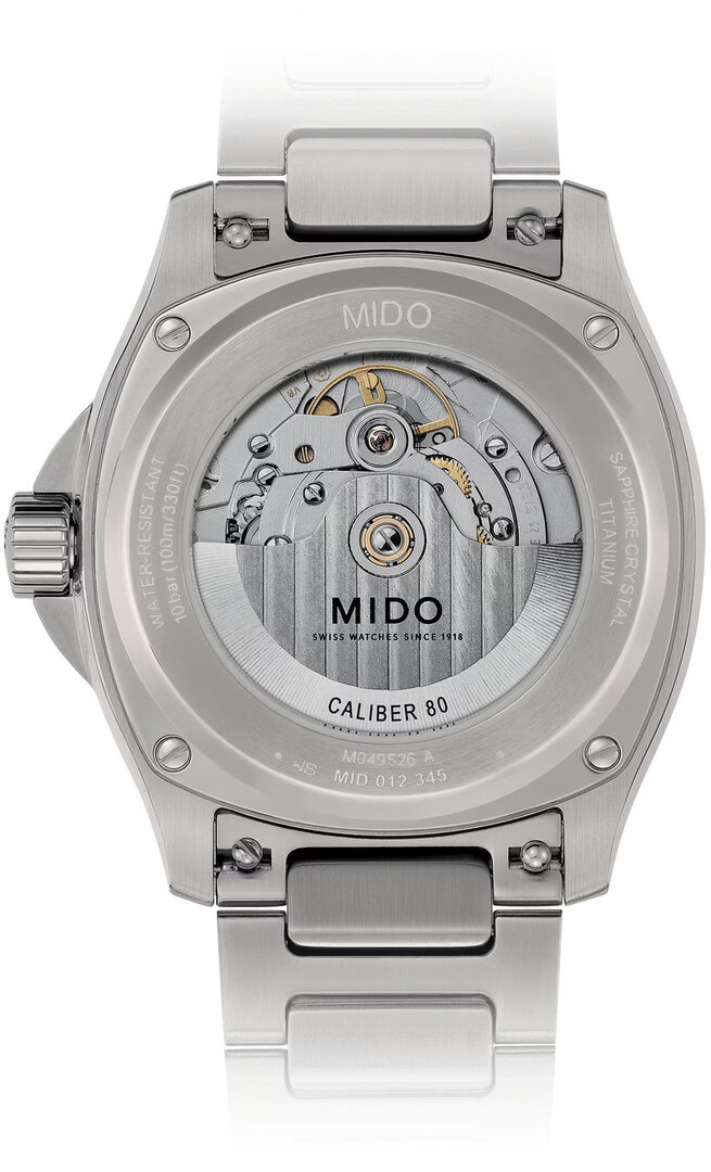 Mechanický s automatickým nátahem. Mido Caliber 80 postavený na ETA C07.621 postavený na ETA 2836-2 postavený na ETA 2824-2, Rezerva chodu 80h, 21.600 BPH (3Hz), 25 kamenů