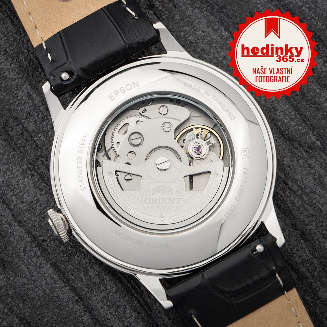Mechanický s automatickým nátahem. Orient F6724, Rezerva chodu 40h, 21.600 BPH (3Hz), 22 kamenů, Hacking, Možnost ručního nátahu