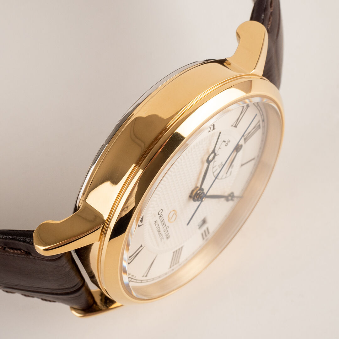 ORIENT STAR odráží více než 60 let hodinářských inovací a zachycuje podstatu značky ORIENT díky odborně zpracovaným vlastním strojkům a nadčasově elegantnímu designu hodinek. Hodinky odkazují na tyto generace hodinářské výroby sofistikovanými římskými číslicemi, pomyslnými ručkami a klasickou zaoblenou korunkou. Číselník má vzorovaný střed obklopený kartáčovaným povrchem a zvýrazněný kontrastním kroužkem s kapitolou, který označuje ubíhající minuty. Indikátor na 12. hodině upozorňuje na 50hodinovou rezervu chodu a naznačuje automatický kalibr F6N43 vlastní výroby, který je viditelný přes výstavní dýnko. Nadčasový půvab hodinkám dodává datumovka na pozici 3. hodiny.