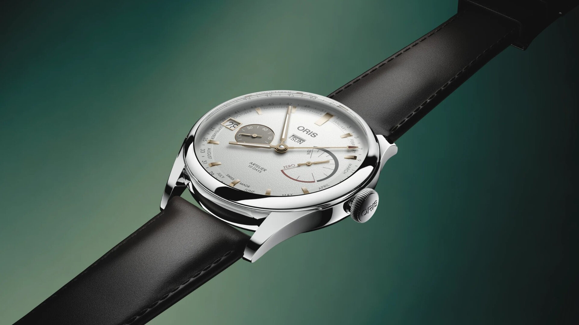 Mechanický s ručním nátahem. Oris 113, Rezerva chodu 240h, 21.600 BPH (3Hz)
