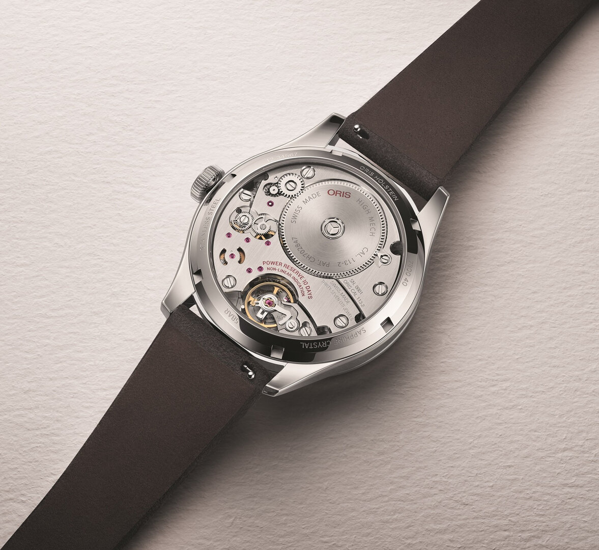 Mechanický s ručním nátahem. Oris 113, Rezerva chodu 240h, 21.600 BPH (3Hz)