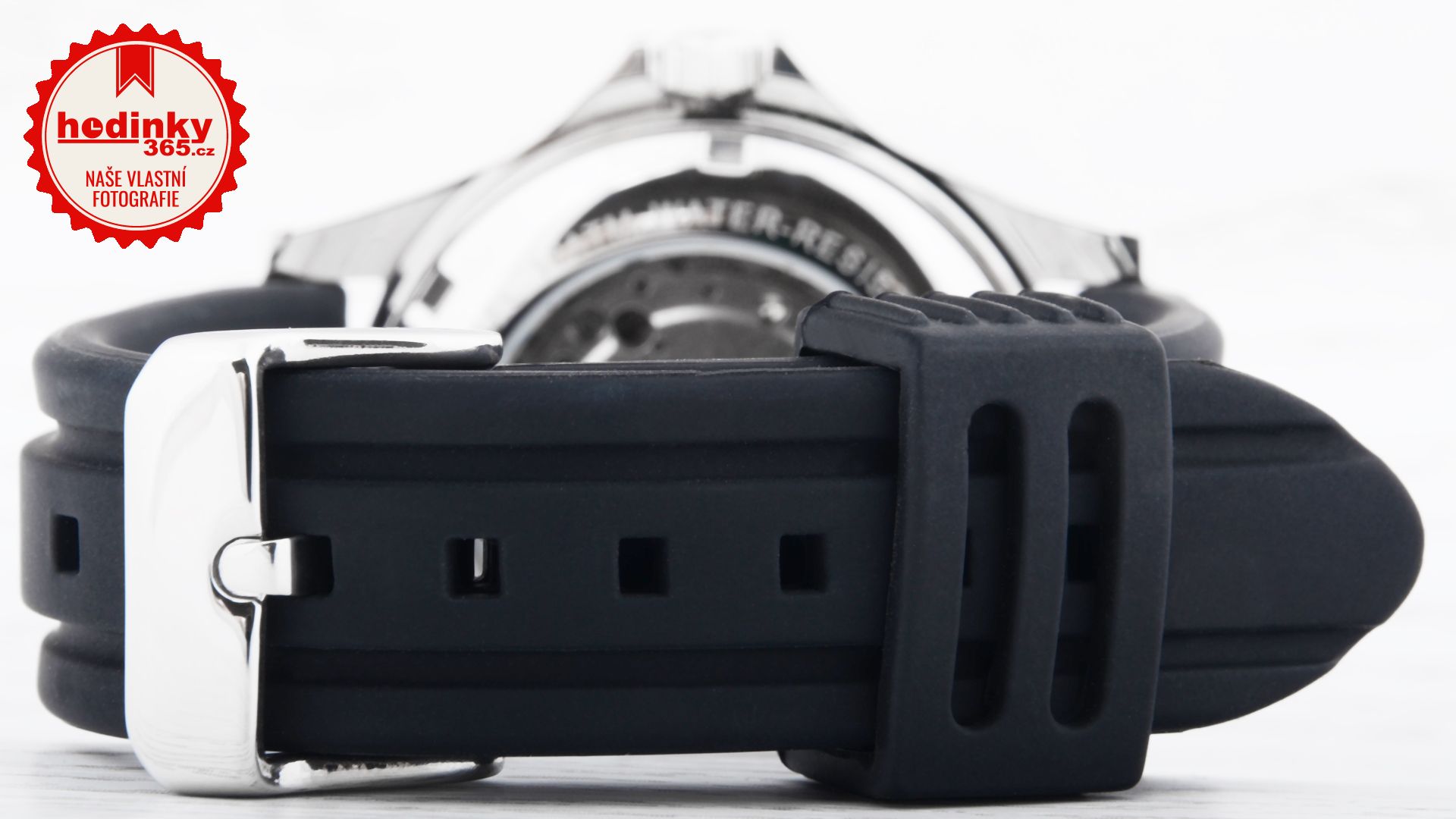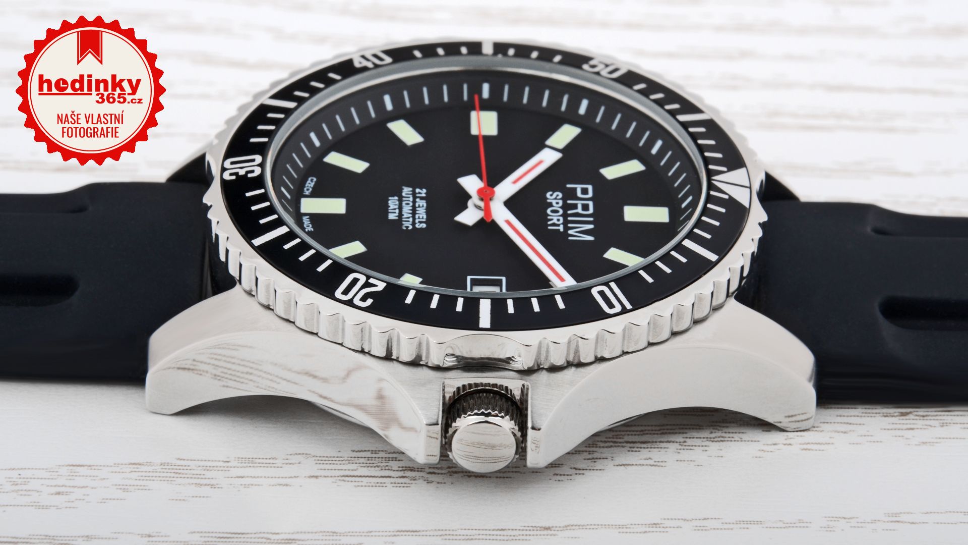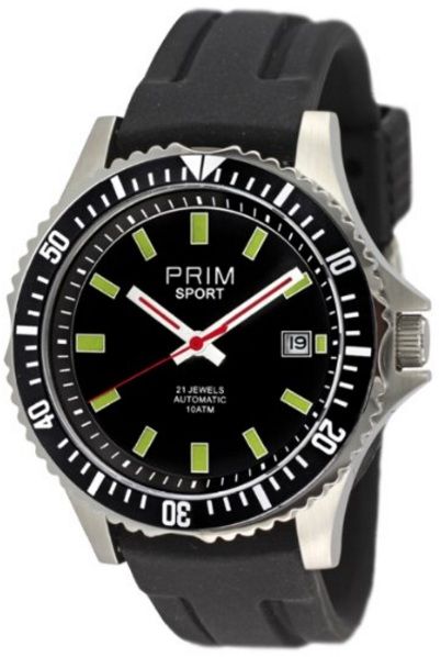 Pánské sportovní hodinky Prim W01C.10001.L jsou kombinací ocelového pouzdra a silikonového řemínku. Pouzdro hodinek je opatřeno černou otočnou lunetou s arabskými číslicemi a průhledným zadním víčkem. Ciferník hodinek je černý a vynikají na něm zelené indexy a červené ručičky. Silikonový řemínek dobře sedí na zápěstí a je opatřen ocelovou standartní sponou. Hodinky jsou poháněny automatickým strojkem. Tento model je vhodný na běžné denní nošení. Tyto sportovní hodinky jsou dodávány spolu se záručním listem v luxusní krabičce.